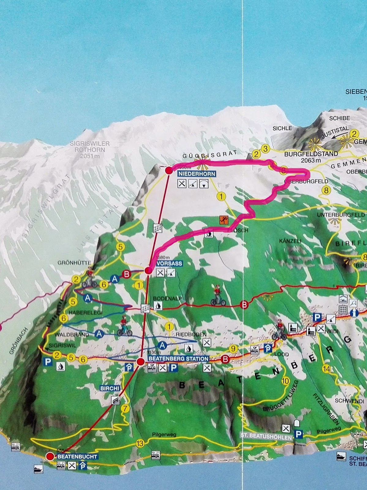 Nejdříve jsme jeli pozemní lanovkou z Beatenbuchtu do stanice Beatenberg (jede každých 20 minut), tady jsme pak přestoupili do kabinové lanovky, kterou jsme se dostali až na vrchol. Odsud jsme měli krásný výhled na Thunské jezero a na horu Niesen – švýcarskou pyramidu, o které jsem psala v jednom z minulých příspěvků.