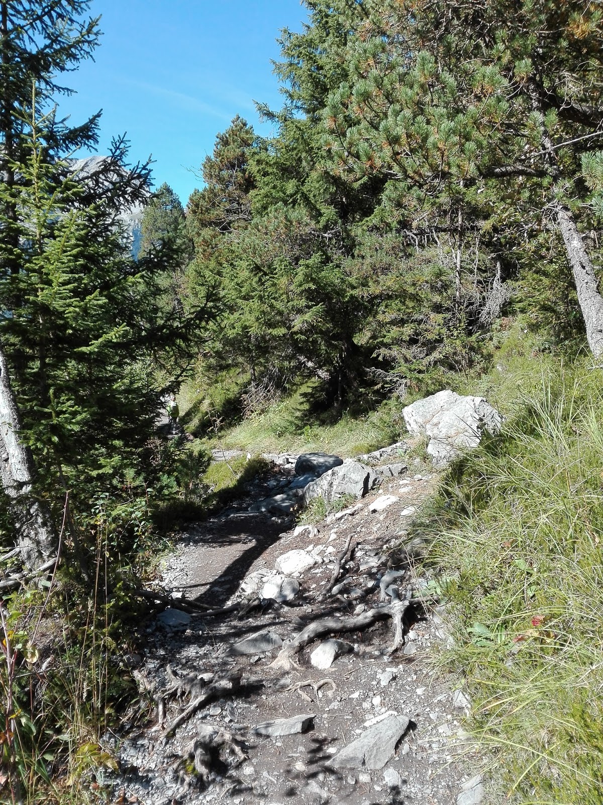 Po krátkém občerstvení a nachytání slunečních paprsků u jezera jsme se vypravili na cestu do údolí. Já už jsem měla tou dobou naši malou v nosítku, i když začátek trasy číslo 4 byl s kočárkem v pohodě sjízdný, protože se šlo po asfaltové silnici, Pak se ale cesta stočila do lesa, kam mířil typický žlutý ukazatel ve tvaru kosočtverce. Možná, že by se dalo s kočárkem sejít až do údolí, pokud by člověk dál pokračoval po silnici (která slouží k zásobování dvou restaurací u jezera a obsluze lyžařských vleků). Ale člověk by tak přišel například o pohled na zurčící horský potok, malé vodopády, možnost zkusit se napít se ledové vody, skákat přes kameny a kořeny jako horský kamzík….