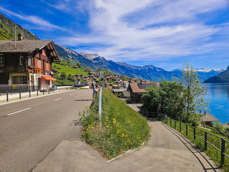 Od parkoviště jsme vyrazili směrem k nádraží a pak přes most okolo spodní stanice Harder Bahn a pokračovali po silnici směrem na Goldswil. V další vesničce Ringgenberg nám to ukazovalo, že bychom měli odbočit na cyklostezku 451 pro horská kola. Ale protože na silnici nebyl moc velký provoz a navíc jsme viděli další cyklisty, jak tudy jezdili, pokračovali jsme dál přes Niederried a Oberried. Krásná pohodová trasa bez velkého převýšení. Po cca 17 kilometrech jsme dorazili do Brienz.